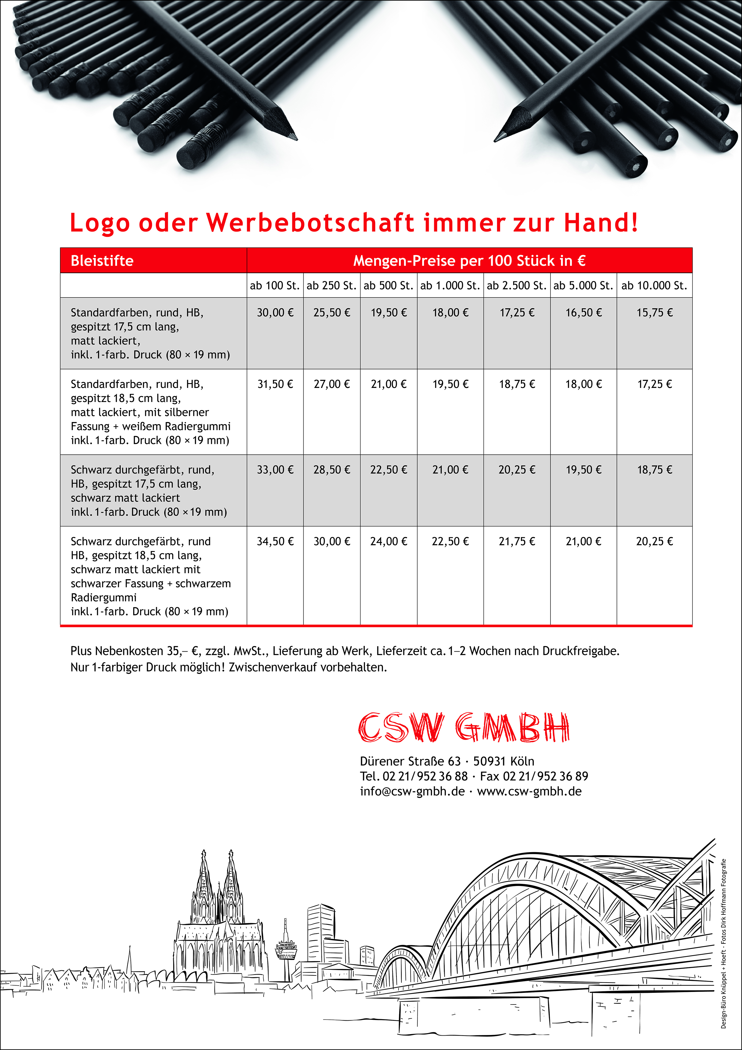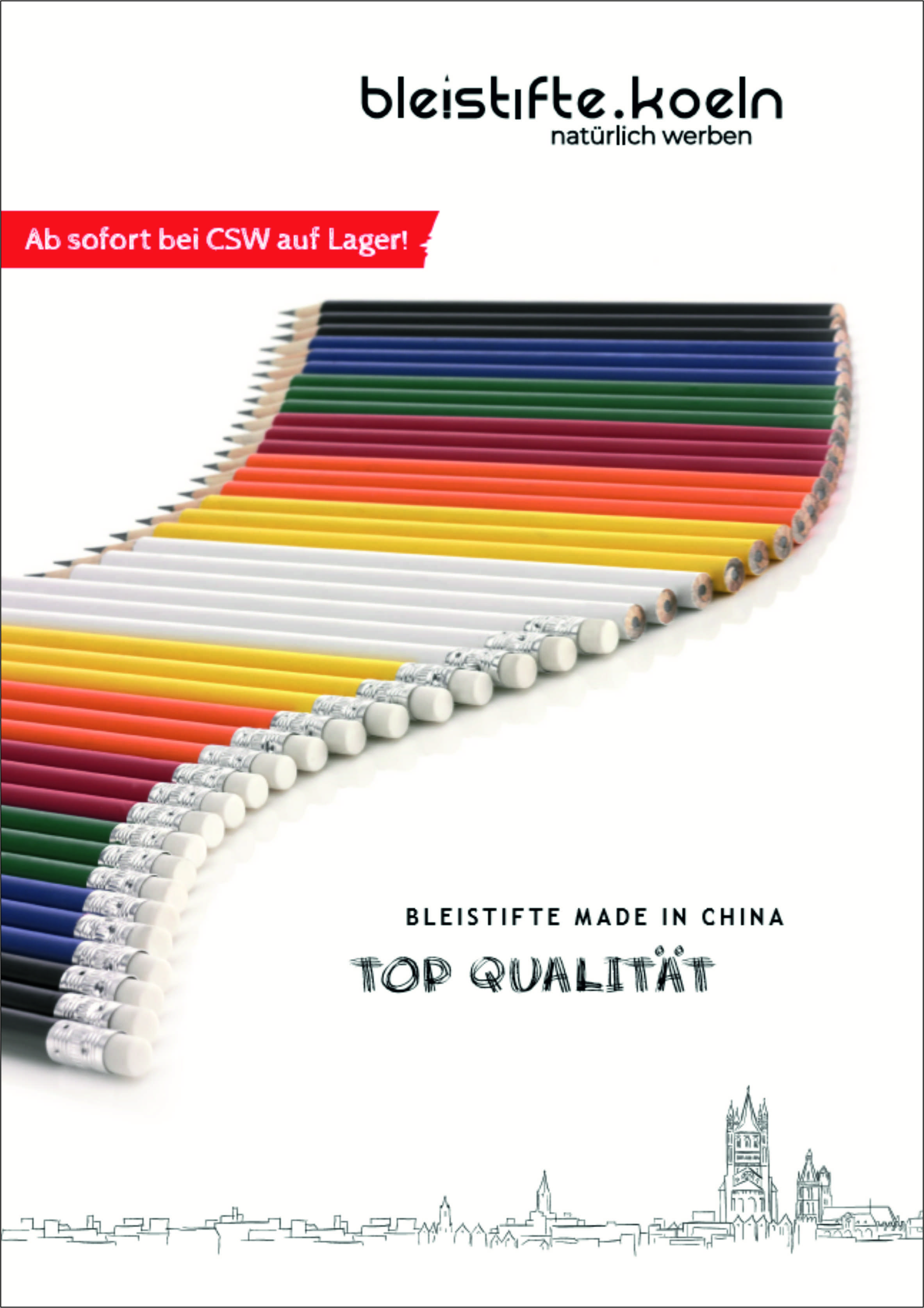 Unser Lager am Standort Köln mit ca. 500 000 Bleistiften in Kombination mit unserer Inhouse- Druckerei ermöglicht es uns, Bleistifte (runde, lange, mit/ohne Radiergummi) in kürzester Zeit – 1-3 Arbeitstage – individuell zu bedrucken und zu versenden. Die max. Druckfläche beträgt 80 x 19 mm.